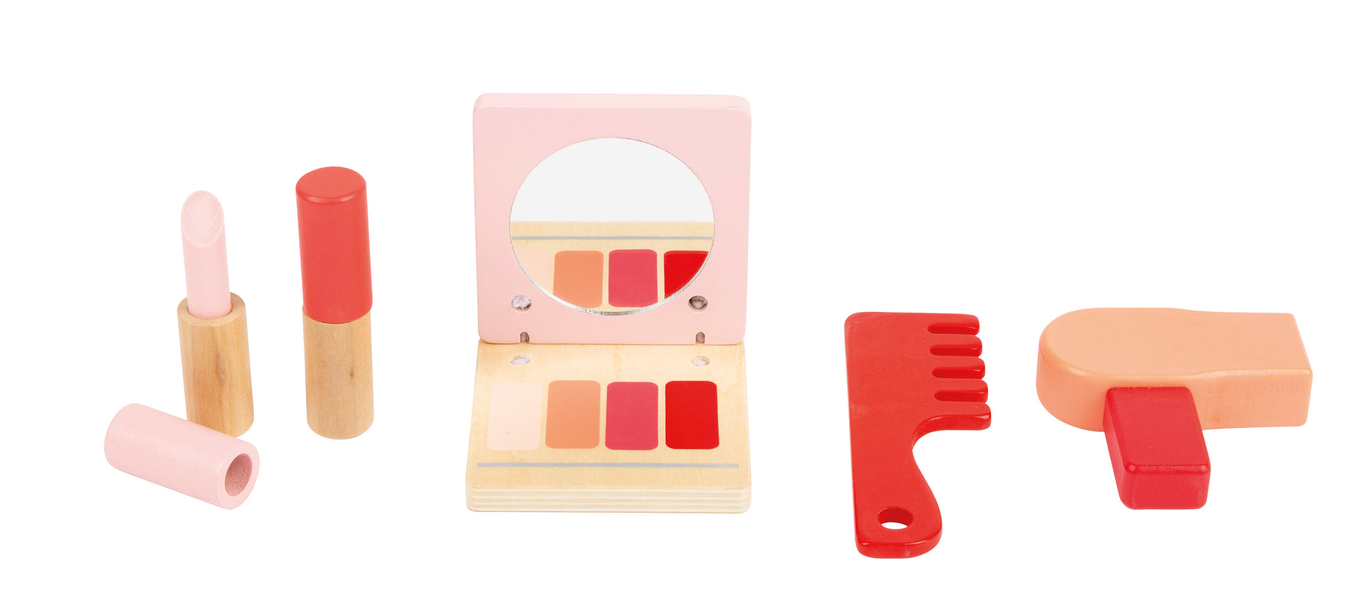 Grâce à son miroir inclinable, les enfants peuvent se coiffer, se maquiller ou simplement s'amuser à se regarder pendant des heures. L’ensemble comprend de nombreux accessoires de maquillage et de coiffure en bois, à ranger facilement dans les trois compartiments du tiroir intégré.