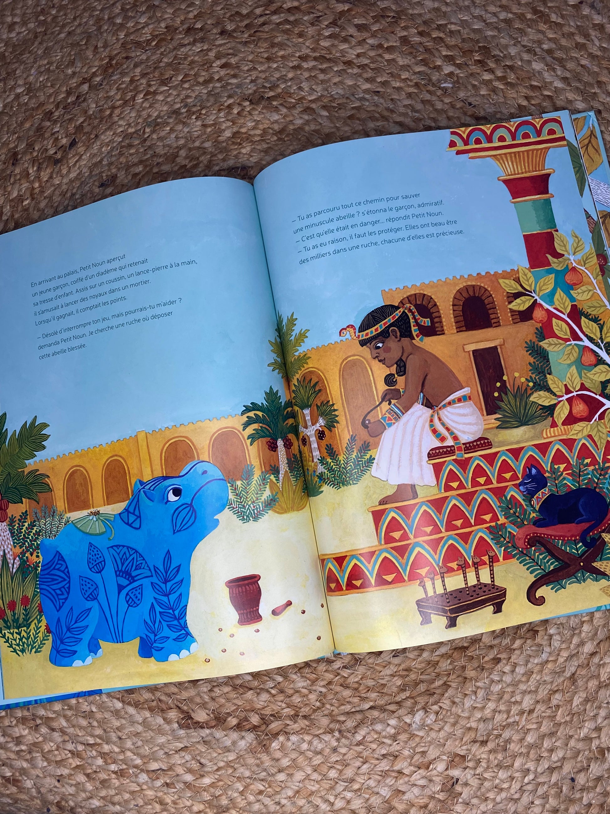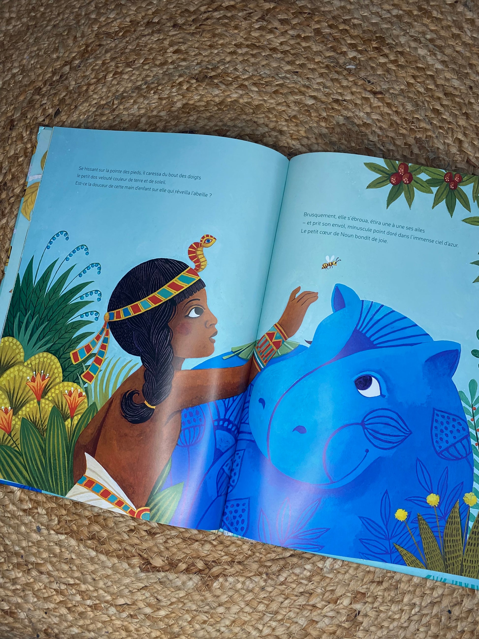 Ce matin-là, une averse inattendue surprend tous les habitants du Nil. Tandis que chacun se secoue et se sèche, une petite abeille reste clouée au sol… Heureusement, Petit Noun, l’adorable hippopotame bleu, veille. Il s’empresse de la protéger, puis la conduit près du palais où, dit-on, les ruches sont nombreuses.
