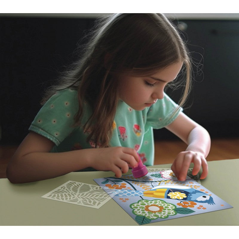 Pour décorer chaque carte, l’enfant n’a qu’à tamponner les motifs à travers les pochoirs, simples à utiliser et lavables à l’eau savonneuse 💧✨. Une activité amusante qui invite à la précision, à l’imagination et au plaisir de créer.