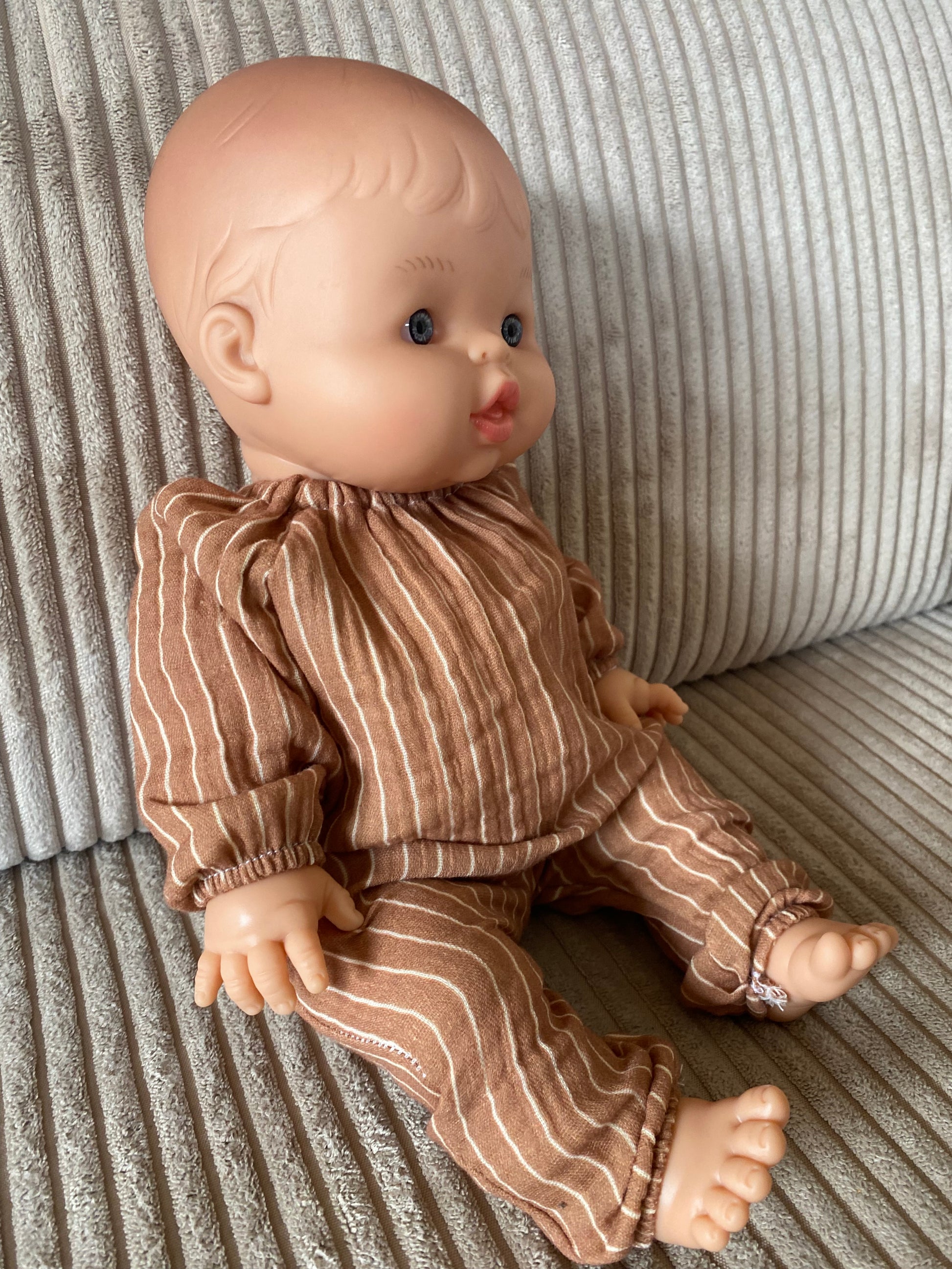 Découvrez Louis, la poupée tendre et élégante qui accompagne les jeux d'imitation avec douceur. Livrée avec sa tenue à rayures fines.