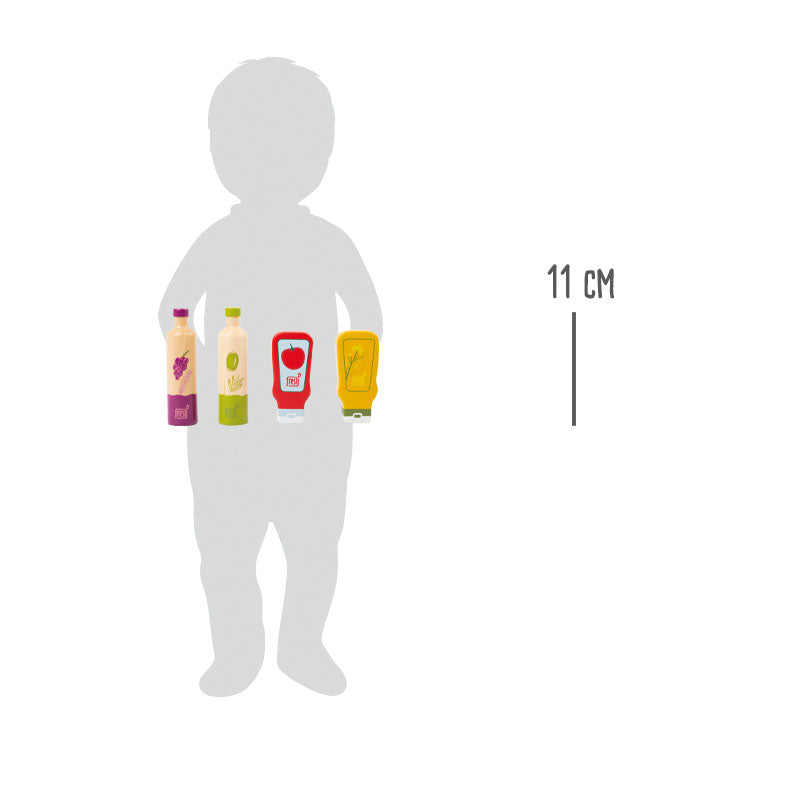 Ce set d’assaisonnement en bois est l’accessoire idéal pour enrichir les cuisines pour enfants et les petites épiceries. Il comprend quatre bouteilles en bois soigneusement conçues : ketchup, moutarde, vinaigre et huile – chacune dans ses couleurs emblématiques pour une reconnaissance facile.