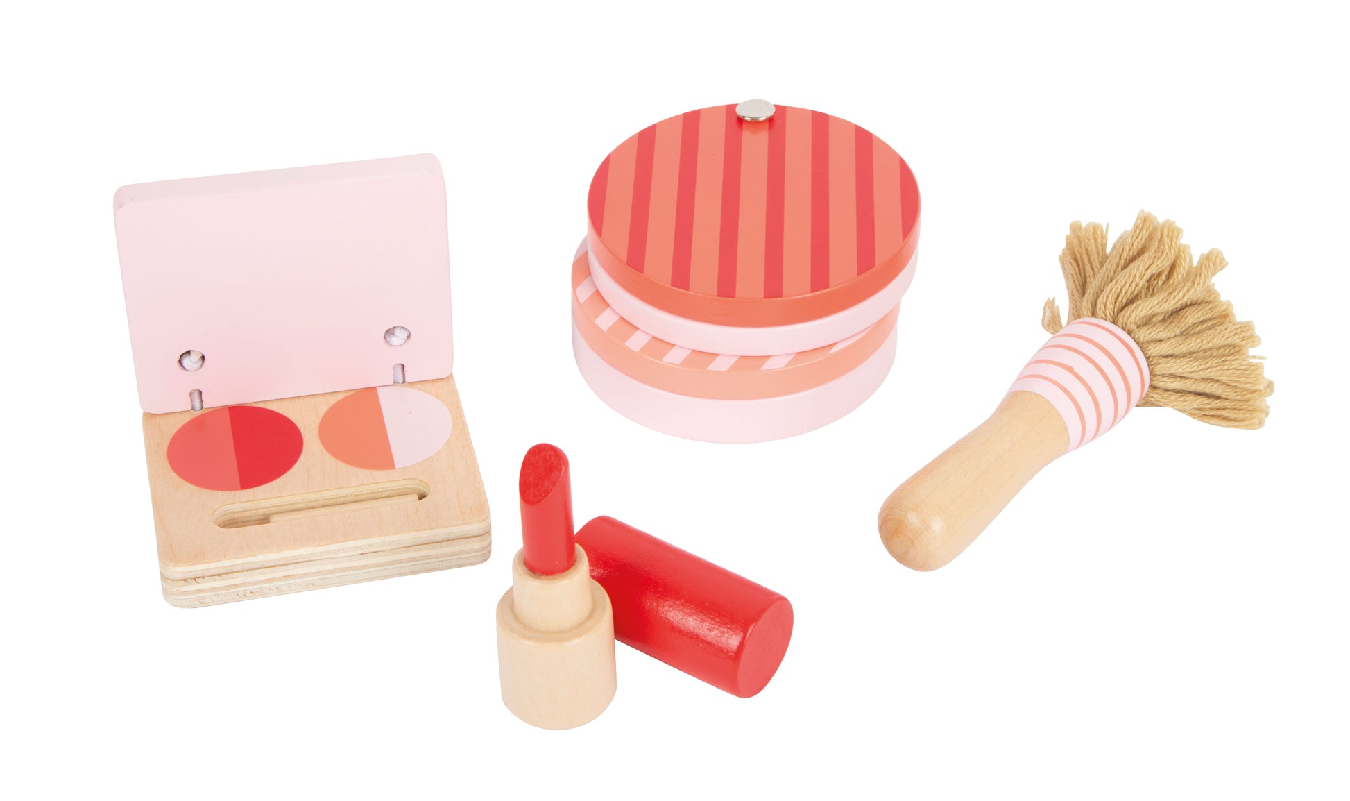 💄 Côté maquillage : poudre, fard à joues, pinceau, rouge à lèvres, fard à paupières et miroir à main pour un look digne des grands.